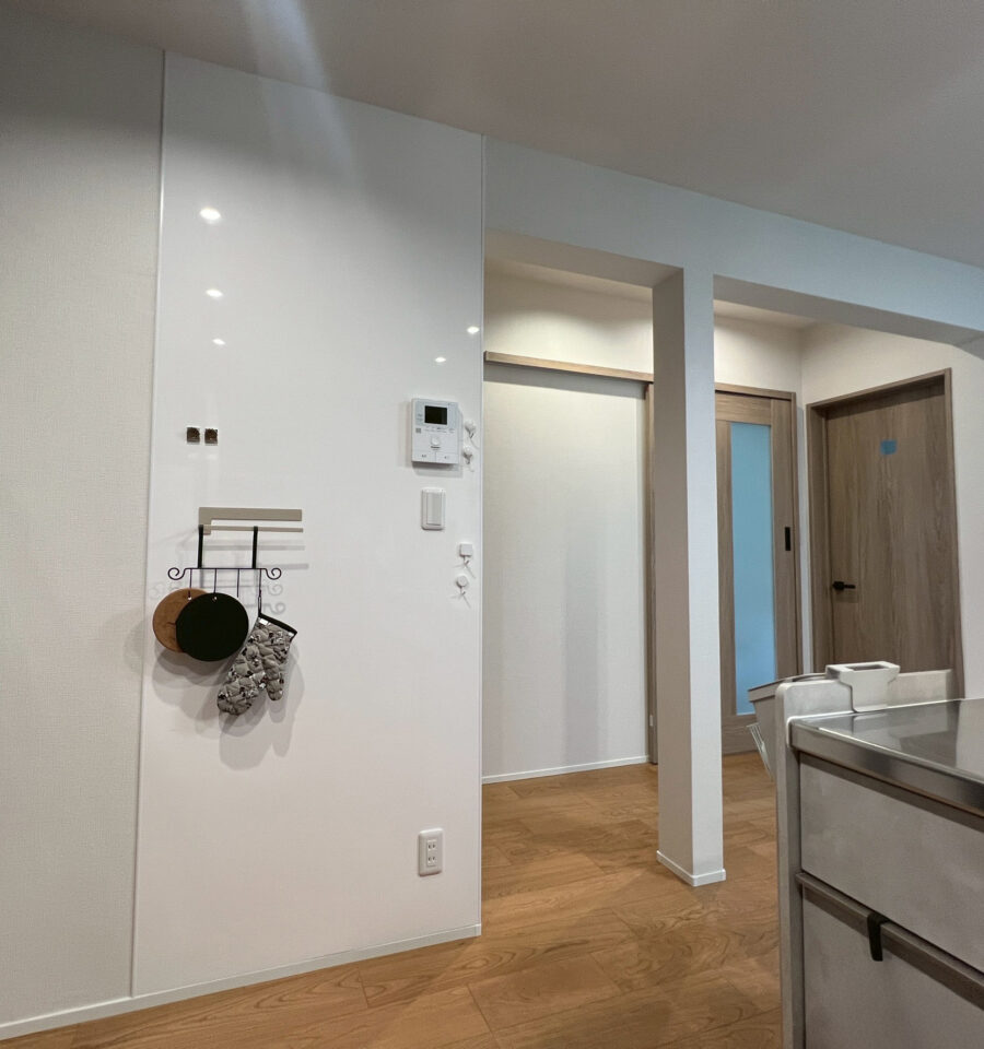 キッチンキャビネットのそばの壁をマグネットウォールにしました。