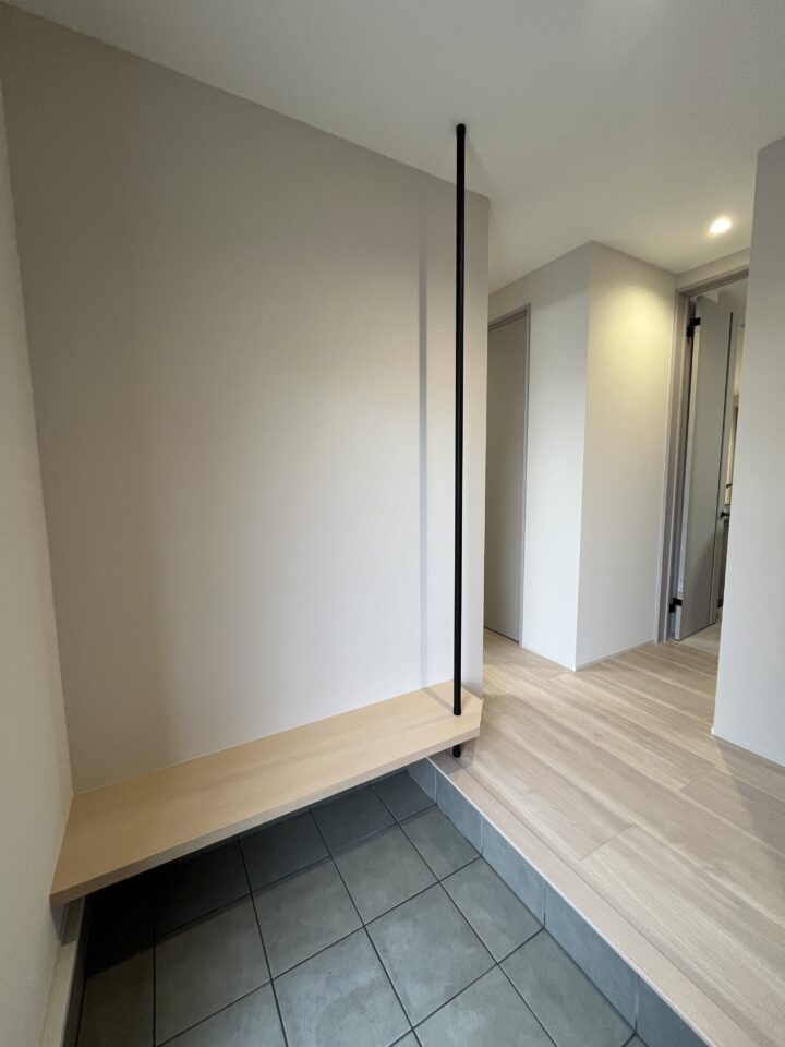 腰を掛けて靴が脱ぎ履きしやすい高さに設計した「造作ベンチ」。黒の手すりが空間のアクセントに。