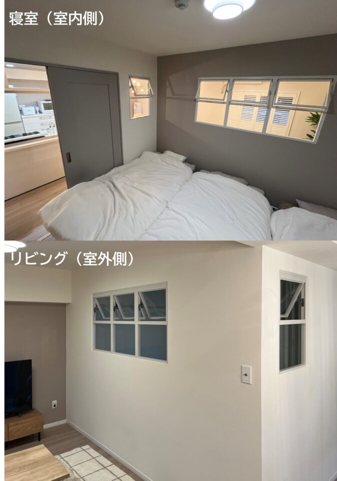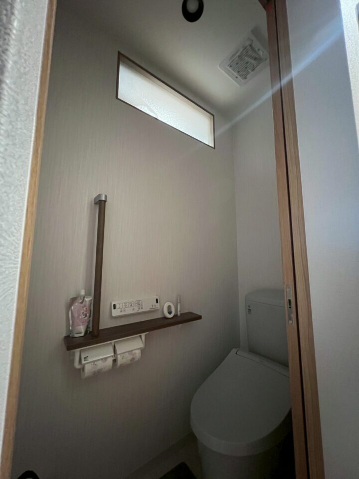 トイレ壁の上部に明り取りのFIX窓を設置。